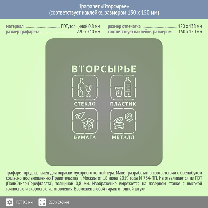 Трафарет «Вторсырьё» предназначен для окраски мусорного контейнера. Макет разработан в соответствии с брендбуком согласно постановления Правительства г. Москвы от 18 июня 2019 года N 734-ПП. Трафарет имеет 5 типоразмеров, каждый из которых соответствует аналогу на самоклеящейся пленке