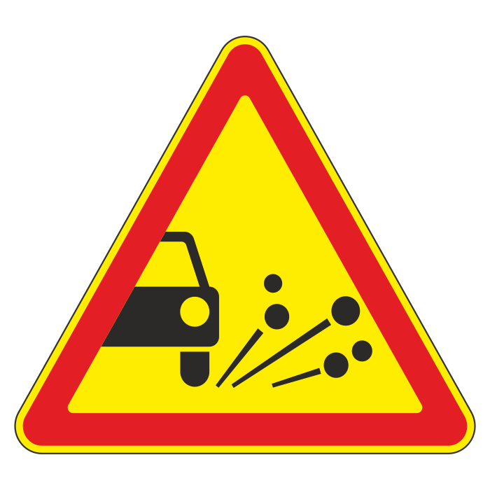 Дорожный знак 1.18 «Выброс гравия» (временный) (металл 0,8 мм, IV типоразмер: сторона 1500 мм, С/О пленка: тип А инженерная) в Новокузнецке купить