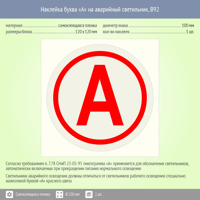 Наклейка буква «А» на аварийный светильник, B92 (пленка, диаметр 100 мм, 120х120 мм) в Новокузнецке купить