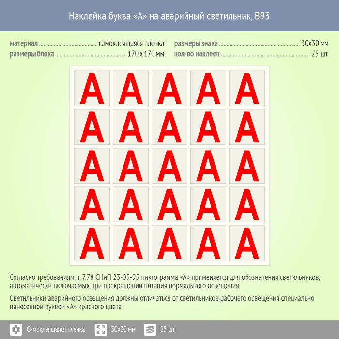 Наклейка буква «А» на аварийный светильник, B93 (пленка, 30х30 мм, блок 25 штук, 170х170 мм) в Новокузнецке купить