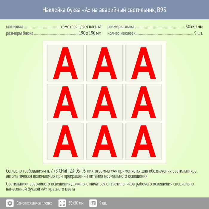 Наклейка буква «А» на аварийный светильник, B93 (пленка, 50х50 мм, блок 9 штук, 190х190 мм) в Новокузнецке купить