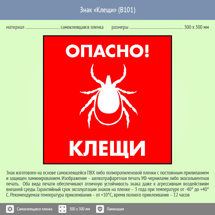 Знак «Опасно! Клещи», B101 (пленка c ламинированием, 300х300 мм) в Новокузнецке купить