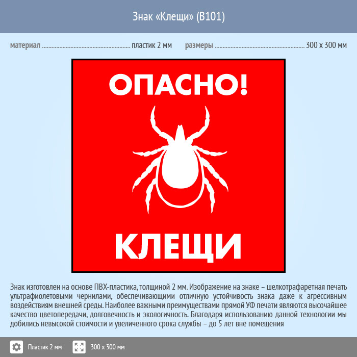 Знак «Опасно! Клещи», B101 (пластик, 300х300 мм) в Новокузнецке купить