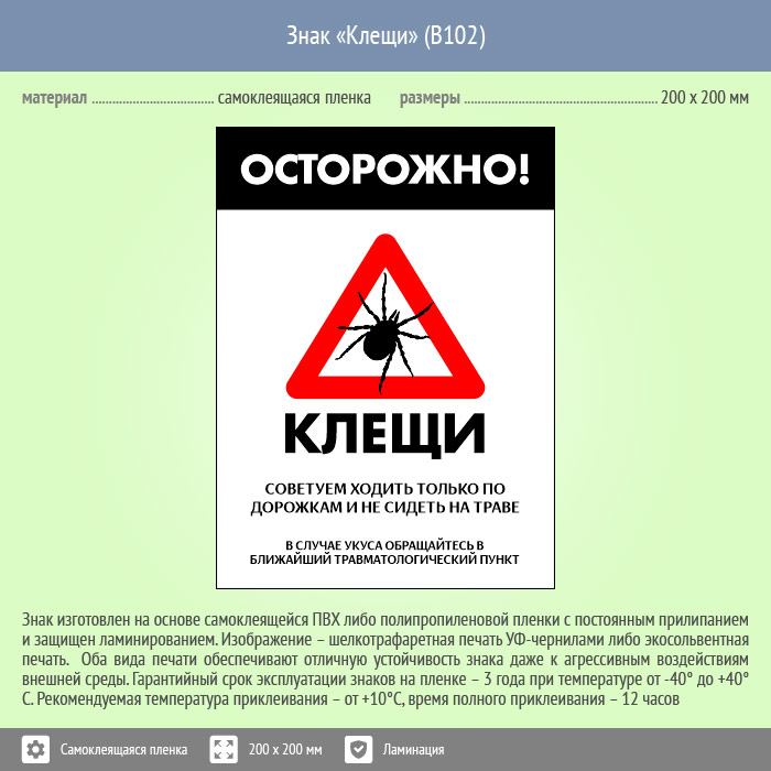 Знак «Осторожно! Клещи», B102 (пленка c ламинированием, 400х600 мм) в Новокузнецке купить