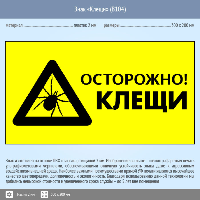 Знак «Осторожно! Клещи», B104 (пластик, 400х300 мм) в Новокузнецке купить