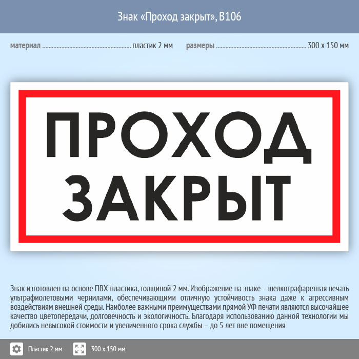 Знак «Проход закрыт», B106 (пластик, 300х150 мм) в Новокузнецке купить