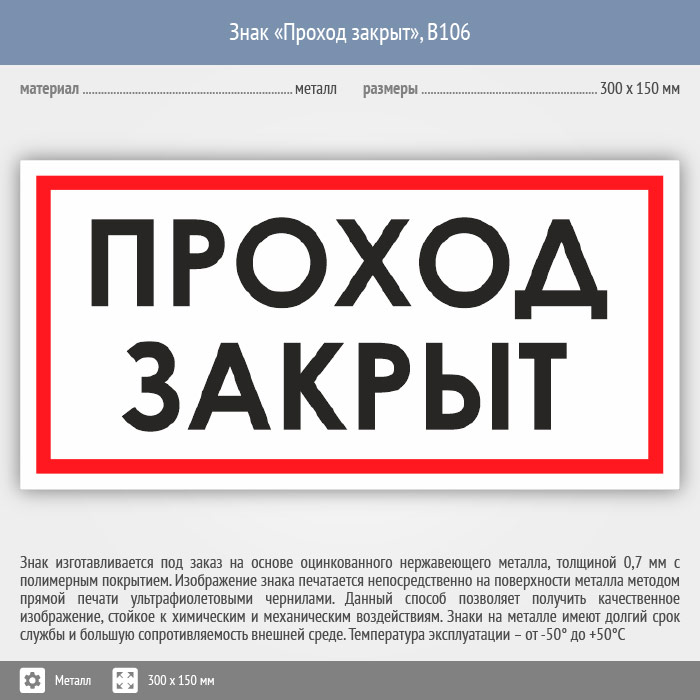 Знак «Проход закрыт», B106 (металл, 300х150 мм) в Новокузнецке купить