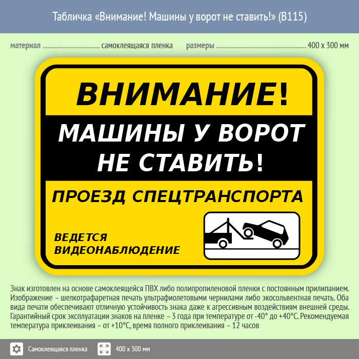 Табличка «Внимание! Машины у ворот не ставить!», B115 (пленка, 400х300 мм) в Новокузнецке купить