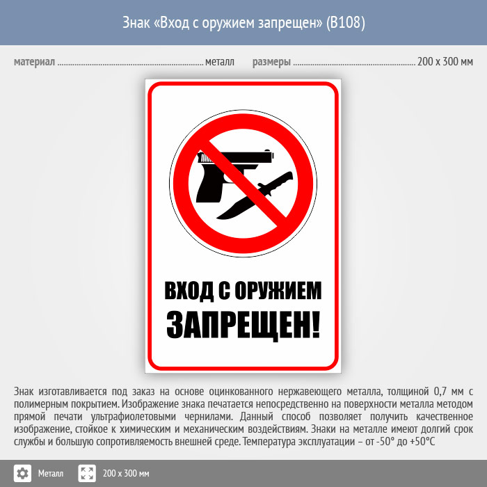 Знак «Вход с оружием запрещен», B108 (металл, 200х300 мм) в Новокузнецке купить