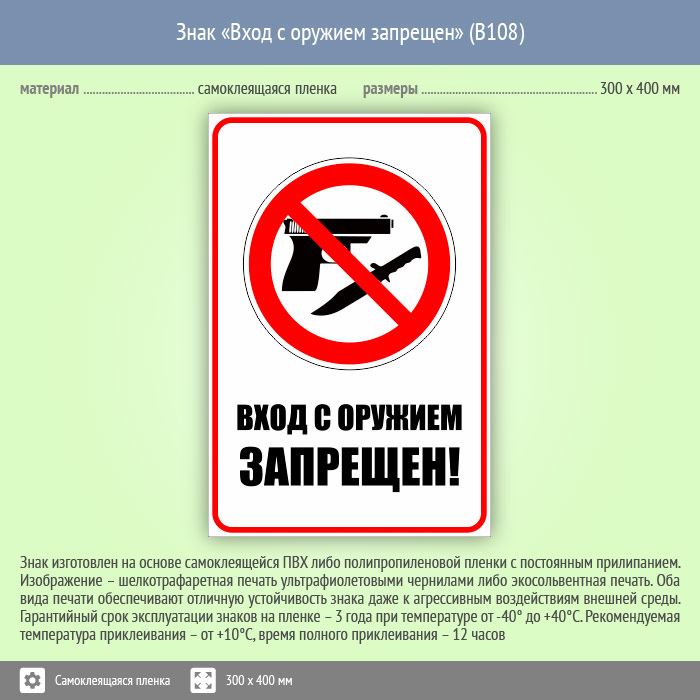 Знак «Вход с оружием запрещен», B108 (пленка, 300х400 мм) в Новокузнецке купить