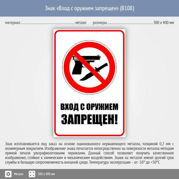 Знак «Вход с оружием запрещен», B108 (металл, 300х400 мм) в Новокузнецке купить
