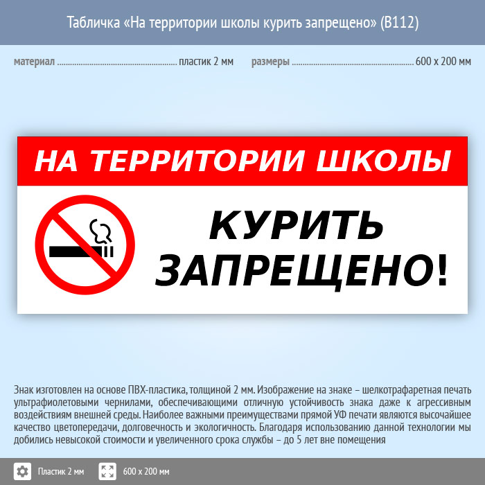 Табличка «На территории школы курить запрещено», B112 (пластик, 600х200 мм) в Новокузнецке купить