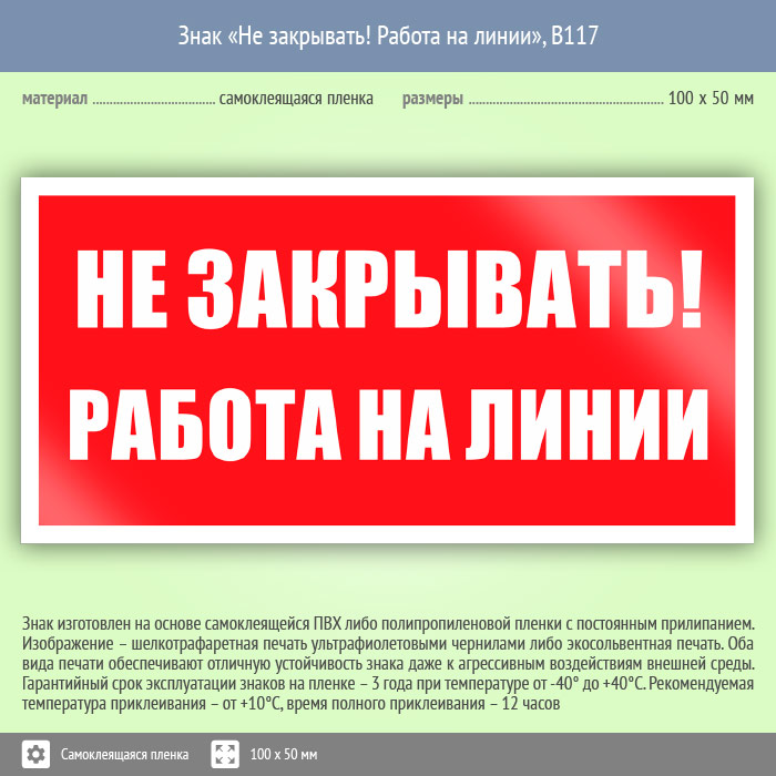 Знак «Не закрывать! Работа на линии», B117 (пленка, 100х50 мм) в Новокузнецке купить