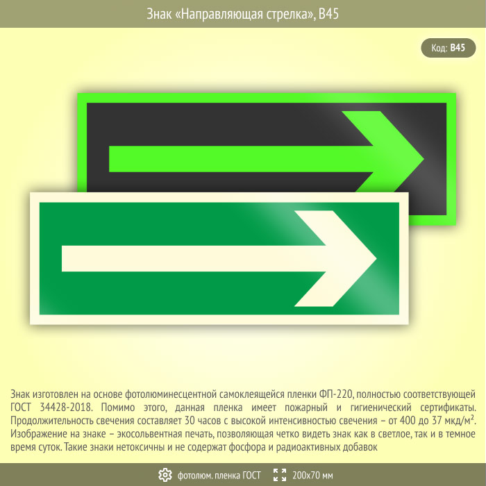 Знак «Направляющая стрелка», B45 (фотолюминесцентная пленка ГОСТ 34428-2018, 200х70 мм) в Новокузнецке купить