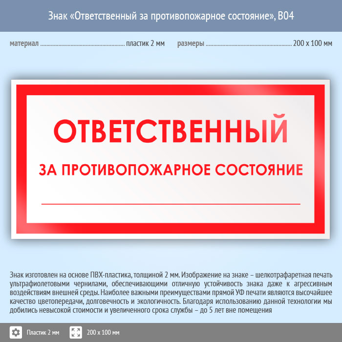 Знак «Ответственный за противопожарное состояние», B04 (пластик, 200х100 мм) в Новокузнецке купить