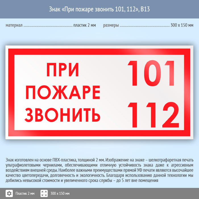 Знак «При пожаре звонить 101, 112», B13 (пластик, 300х150 мм) в Новокузнецке купить