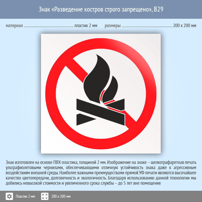 Знак «Разведение костров строго запрещено», B29 (пластик, 200х200 мм) в Новокузнецке купить