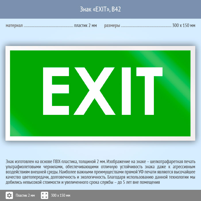 Знак «EXIT», B42 (пластик, 300х150 мм) в Новокузнецке купить