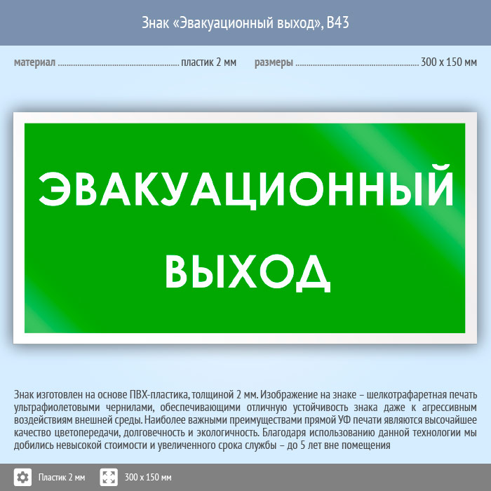 Знак «Эвакуационный выход», B43 (пластик, 300х150 мм) в Новокузнецке купить