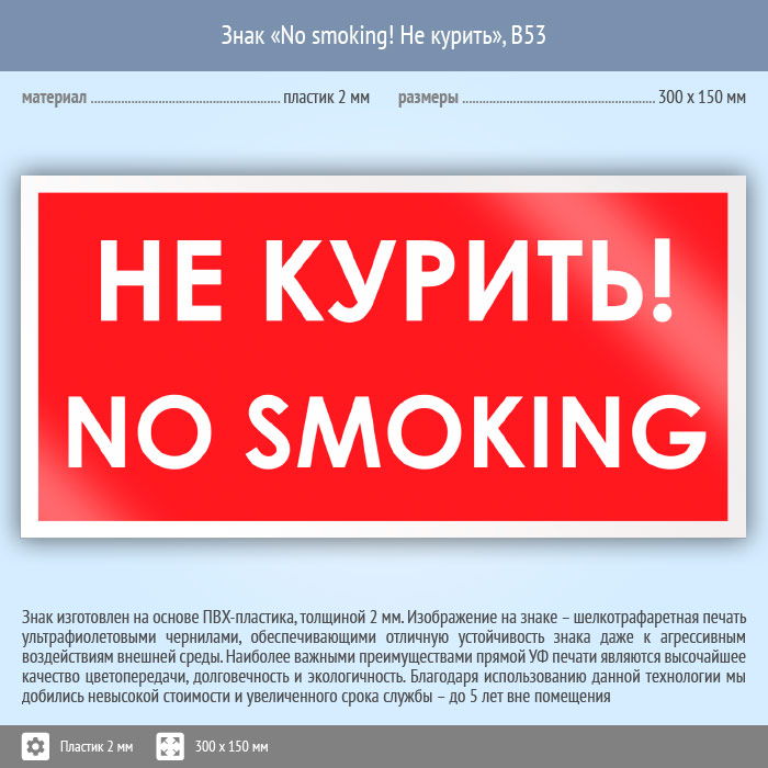 Знак «No smoking! Не курить», B53 (пластик, 300х150 мм) в Новокузнецке купить