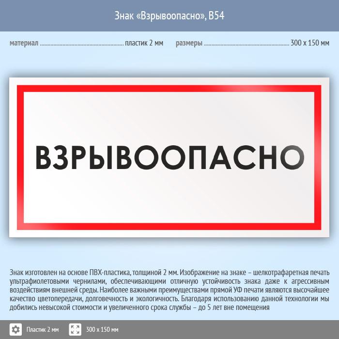 Знак «Взрывоопасно», B54 (пластик, 300х150 мм) в Новокузнецке купить