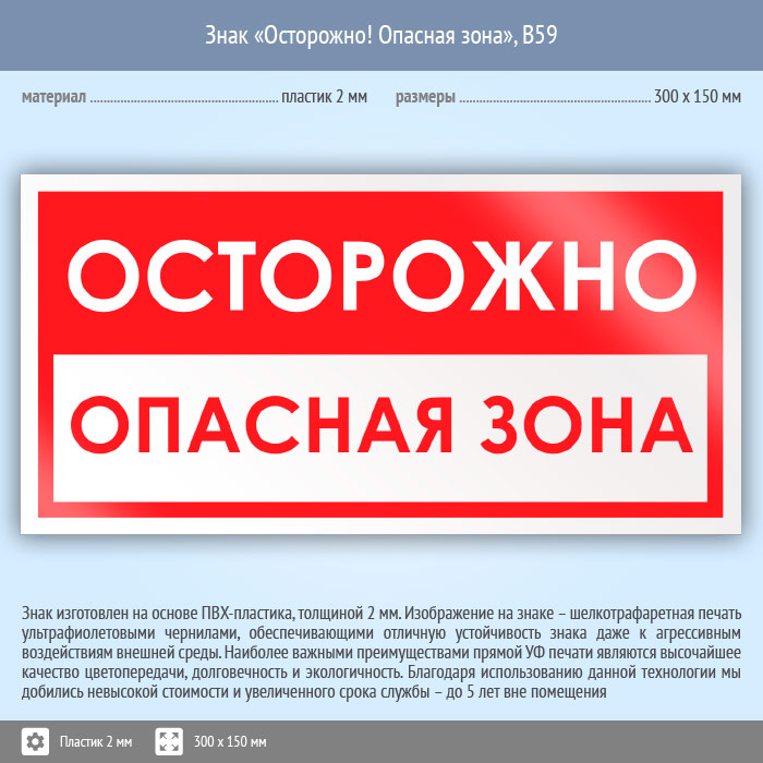 Знак «Осторожно! Опасная зона», B59 (пластик, 300х150 мм) в Новокузнецке купить