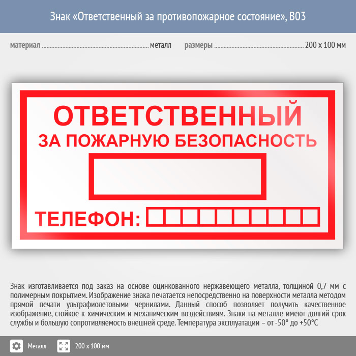Знак «Ответственный за пожарную безопасность», B03 (металл, 200х100 мм) в Новокузнецке купить
