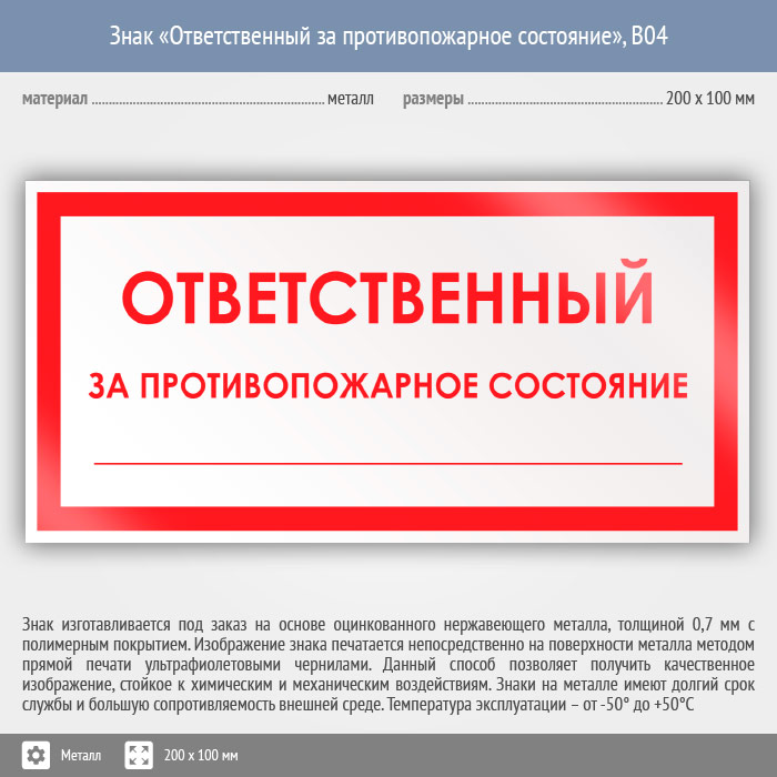 Знак «Ответственный за противопожарное состояние», B04 (металл, 200х100 мм) в Новокузнецке купить