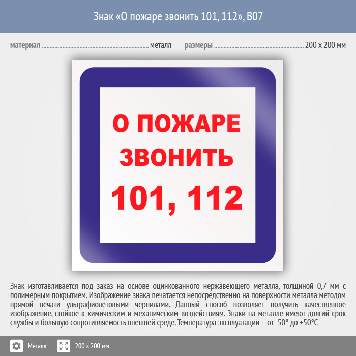 Знак «О пожаре звонить 101, 112», B07 (металл, 200х200 мм) в Новокузнецке купить