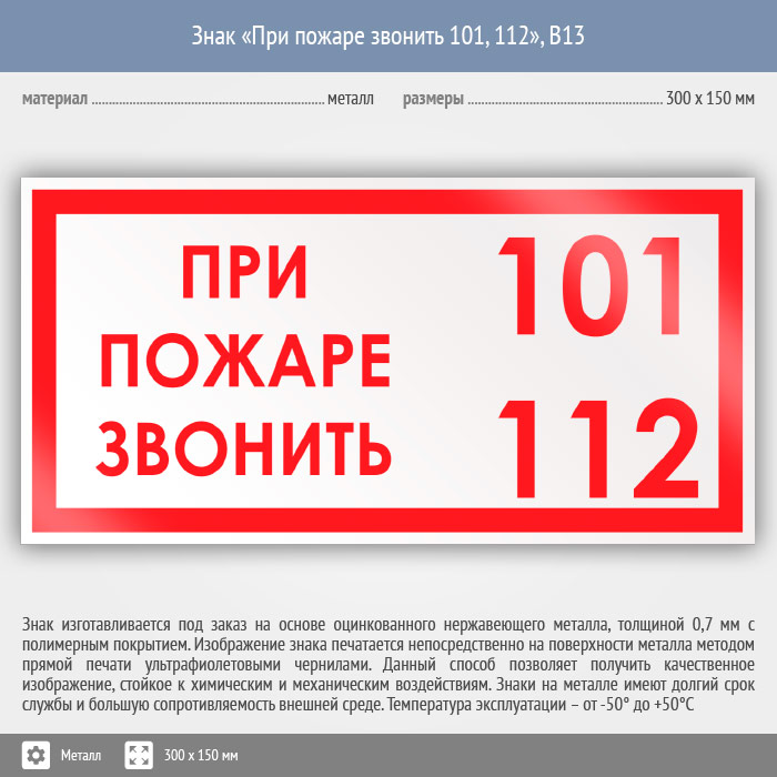 Знак «При пожаре звонить 101, 112», B13 (металл, 300х150 мм) в Новокузнецке купить