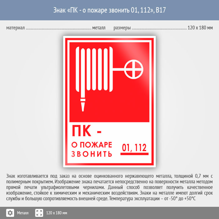 Знак «ПК - о пожаре звонить 01, 112», B17 (металл, 120х180 мм) в Новокузнецке купить