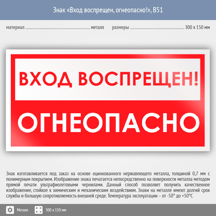 Знак «Вход воспрещен, огнеопасно!», B51 (металл, 300х150 мм) в Новокузнецке купить