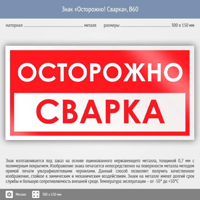 Знак «Осторожно! Сварка», B60 (металл, 300х150 мм) в Новокузнецке купить