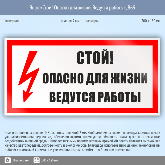 Знак «Стой! Опасно для жизни. Ведутся работы», B69 (пластик, 300х150 мм) в Новокузнецке купить