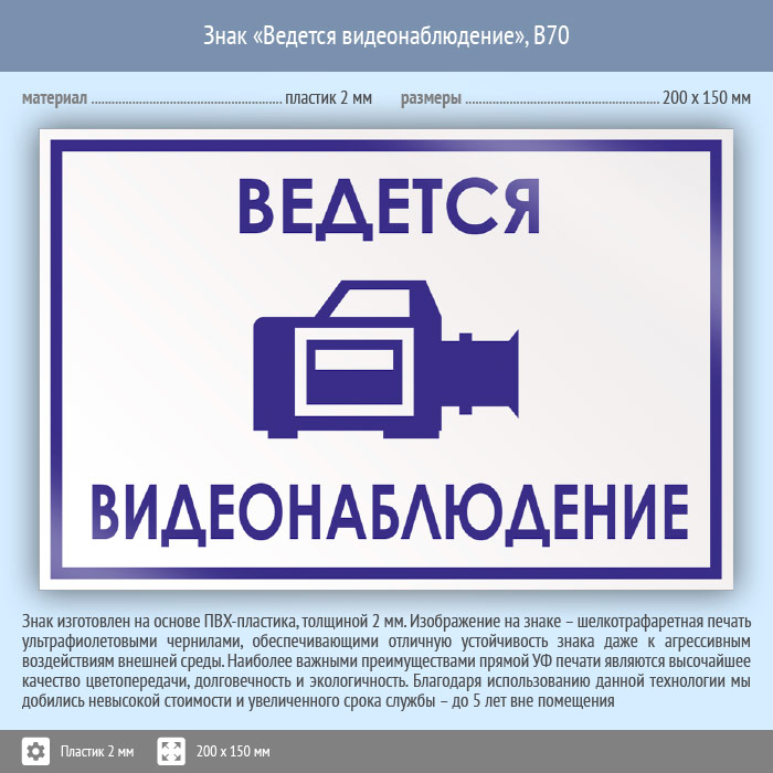 Знак «Ведется видеонаблюдение», B70 (пластик, 200х150 мм) в Новокузнецке купить