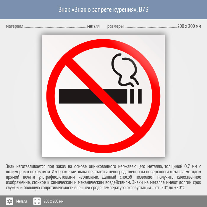 Знак «Знак о запрете курения», B73 (металл, 200х200 мм) в Новокузнецке купить