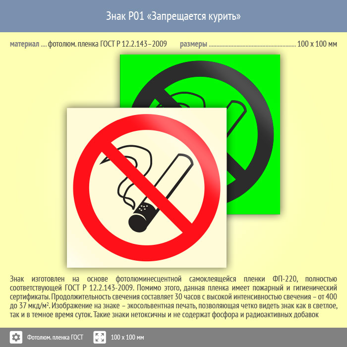 Знак P01 «Запрещается курить» (фотолюминесцентная пленка ГОСТ 34428-2018, 100х100 мм) в Новокузнецке купить