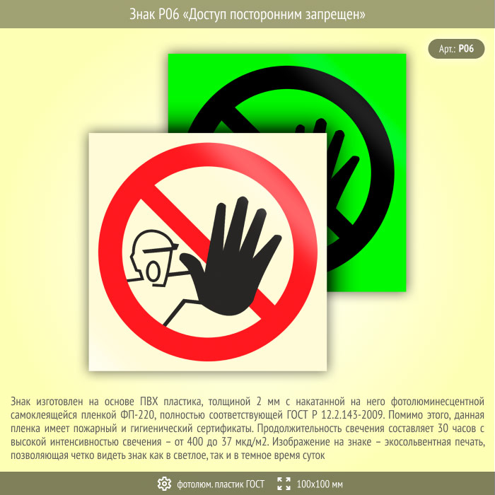 Знак P06 «Доступ посторонним запрещен» (фотолюминесцентный пластик ГОСТ 34428-2018, 100х100 мм) в Новокузнецке купить