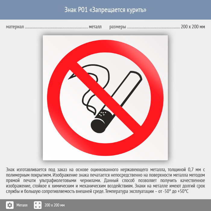 Знак P01 «Запрещается курить» (металл, 200х200 мм) в Новокузнецке купить