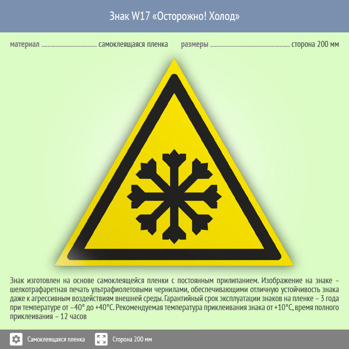 Знак «Осторожно! Холод» имеет размер сторона 200 мм