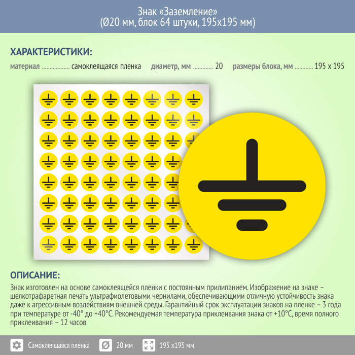 Знак (плакат) «Заземление», S46 (пленка, диаметр 20 мм, блок 64 штуки, 195х195 мм) в Новокузнецке купить
