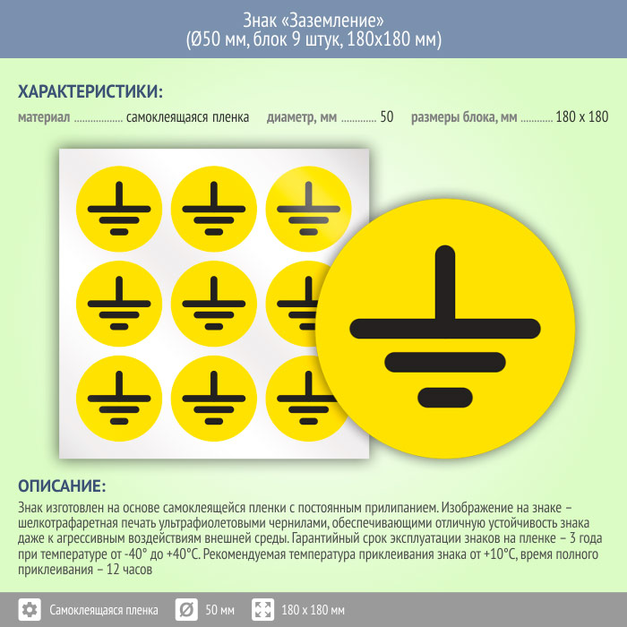 Знак (плакат) «Заземление», S46 (пленка, диаметр 50 мм, блок 9 штук, 180х180 мм) в Новокузнецке купить