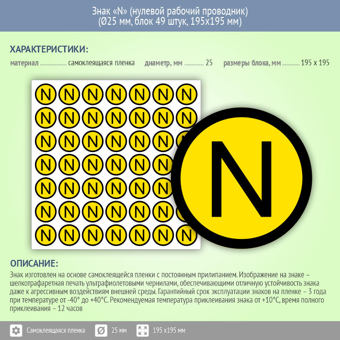 Знак (плакат) «N» (нулевой рабочий проводник), S47 (пленка, диаметр 25 мм, блок 49 штук, 195х195 мм) в Новокузнецке купить