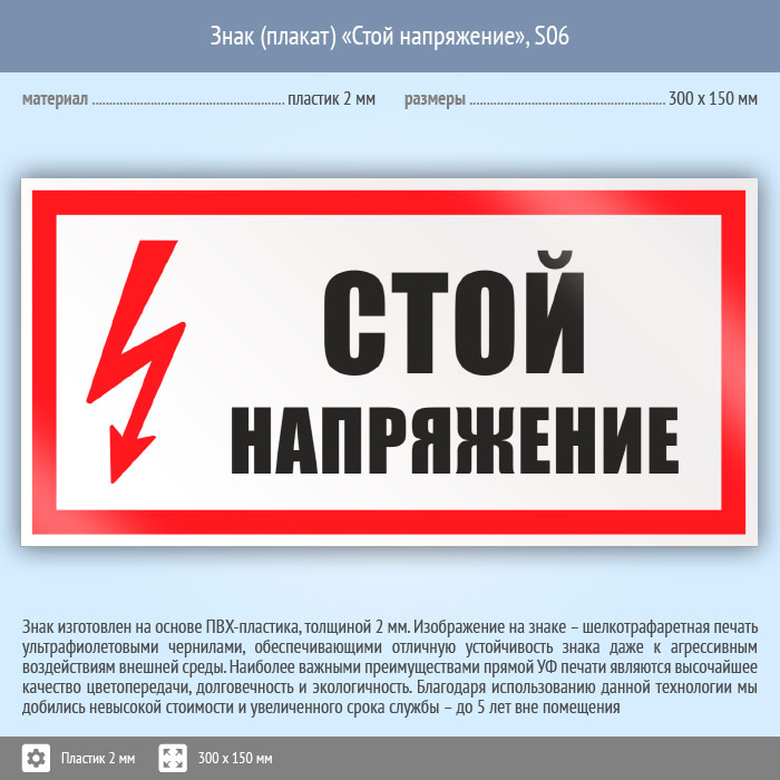 Знак (плакат) «Стой напряжение», S06 (пластик, 300х150 мм) в Новокузнецке купить