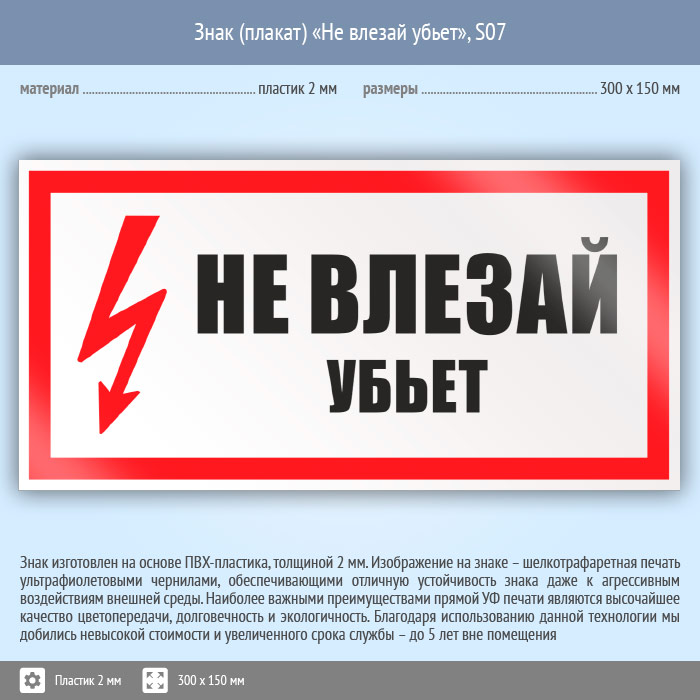 Знак (плакат) «Не влезай убьет», S07 (пластик, 300х150 мм) в Новокузнецке купить