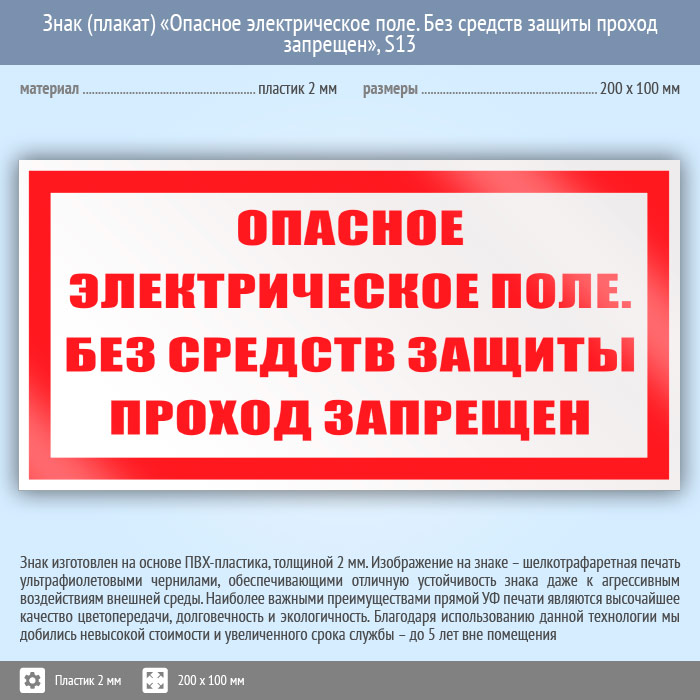 Знак (плакат) «Опасное электрическое поле. Без средств защиты проход запрещен», S13 (пластик, 200х100 мм) в Новокузнецке купить