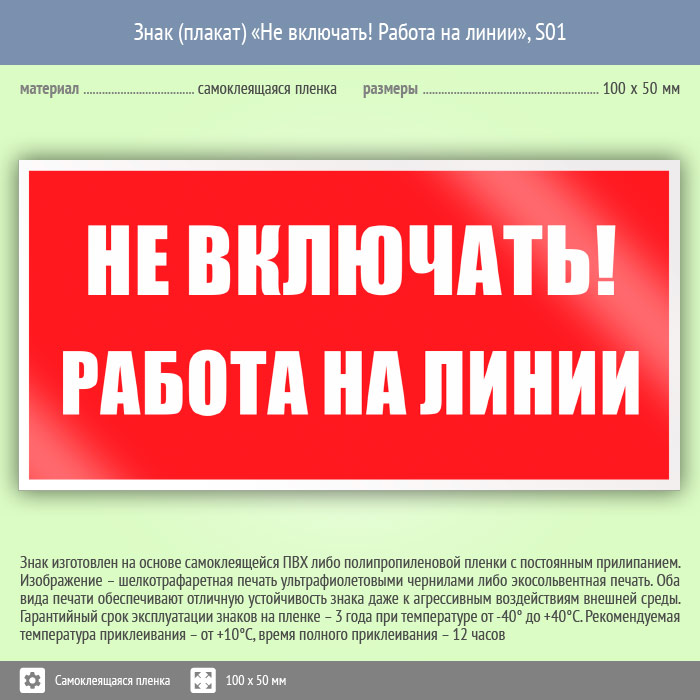 Знак (плакат) «Не включать! Работа на линии», S01 (пленка, 100х50 мм) в Новокузнецке купить