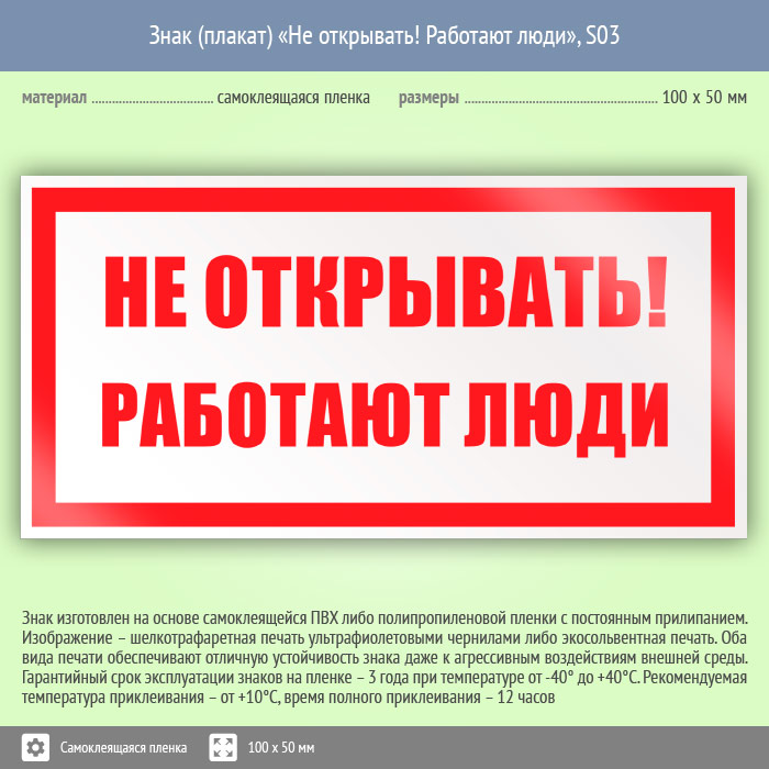 Знак (плакат) «Не открывать! Работают люди», S03 (пленка, 100х50 мм) в Новокузнецке купить