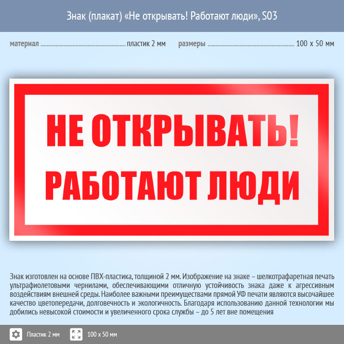 Знак (плакат) «Не открывать! Работают люди», S03 (пластик, 100х50 мм) в Новокузнецке купить