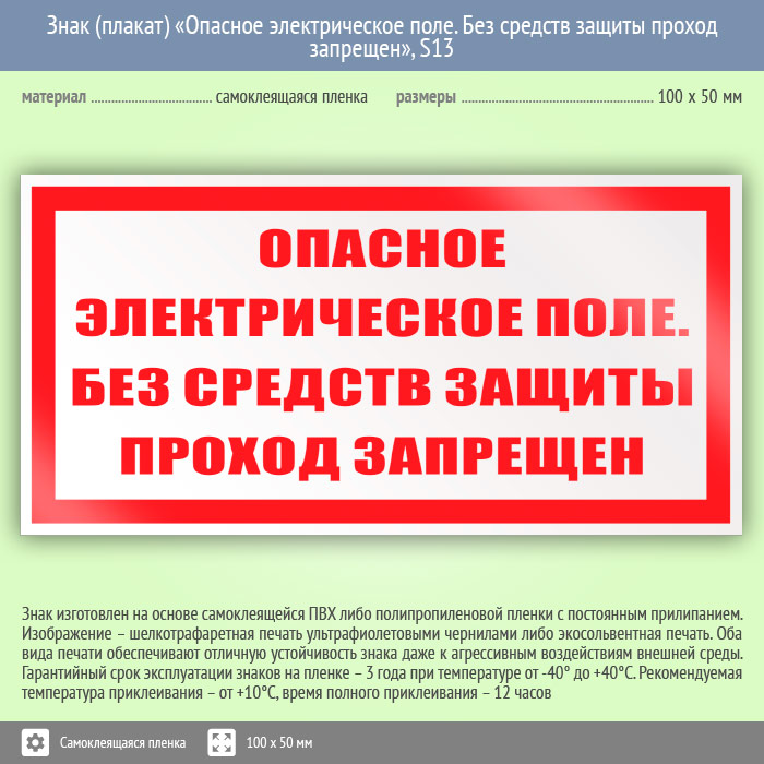 Знак (плакат) «Опасное электрическое поле. Без средств защиты проход запрещен», S13 (пленка, 100х50 мм) в Новокузнецке купить